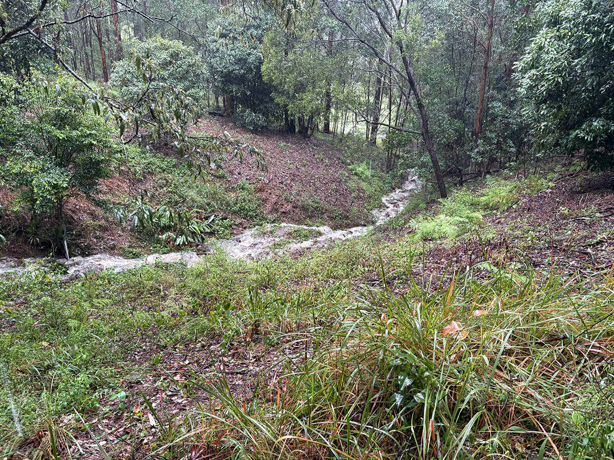 Our property occupies parts of two upper catchments of the Nerang River system which drain a large proportion of the eastern side of Mount Nathan. The southern drainage area is very steep with a fast flowing channel that is deeply incised into bedrock. Its catchment area is entirely forested right to our eastern boundary. The catchment area on the northern end of our forest is smaller in area and less steep than the southern catchment, and is the subject of this article.