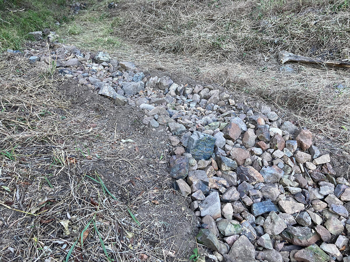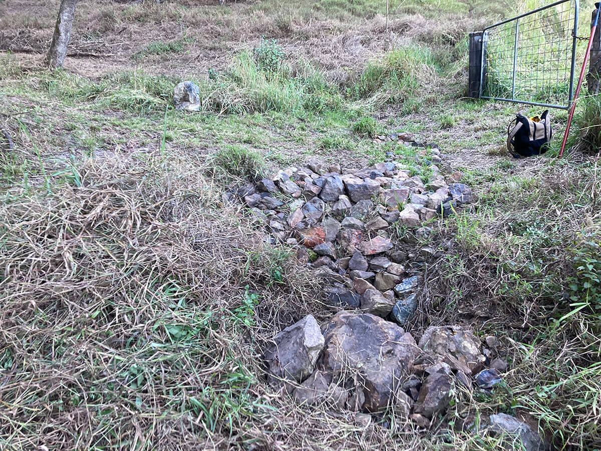 The length of drainage line in Zone 1 is 125m, with an average gradient of 2.7% at the property boundary, decreasing to 1.6% at the gateway. On occupancy, the area within the channel and its side slopes were heavily infested with Lantana, Tobacco Bush and Devils Fig. It was used by feral deer as a main thoroughfare. The initial focus was on weed removal, followed by construction of rock sediment traps, and rock lining to stabilise the channel floor and parts of the side walls to reduce bank undercutting. At those points where the channel was deeply incised, a rock flume was constructed to safely convey runoff through a 1-1.5 metre drop in channel level. The main hydraulic construction is the 10sqm rock flume at the gateway, to control the bed erosion in this area and to safely convey runoff to Zone 2.