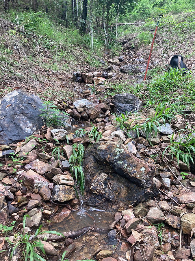The area of the southern catchment is 3.6ha of which 0.56ha is within our property. The length of the main channel is 375m of which 185m flows through our property. The elevation range is 160m from the summit of Mount Nathan to where the main channel leaves our property on the eastern boundary. The average slope of the total channel is 4.2% so it is very steep and fast flowing. Approximately 80% of the catchment is open eucalypt forest. Various rainforest species occur in the shady confines of the drainage line. The remaining 20% is advanced regrowth forest and portions of the lower catchment area were partially cleared in the past for grazing on our property and for banana plantation on the neighbouring property.