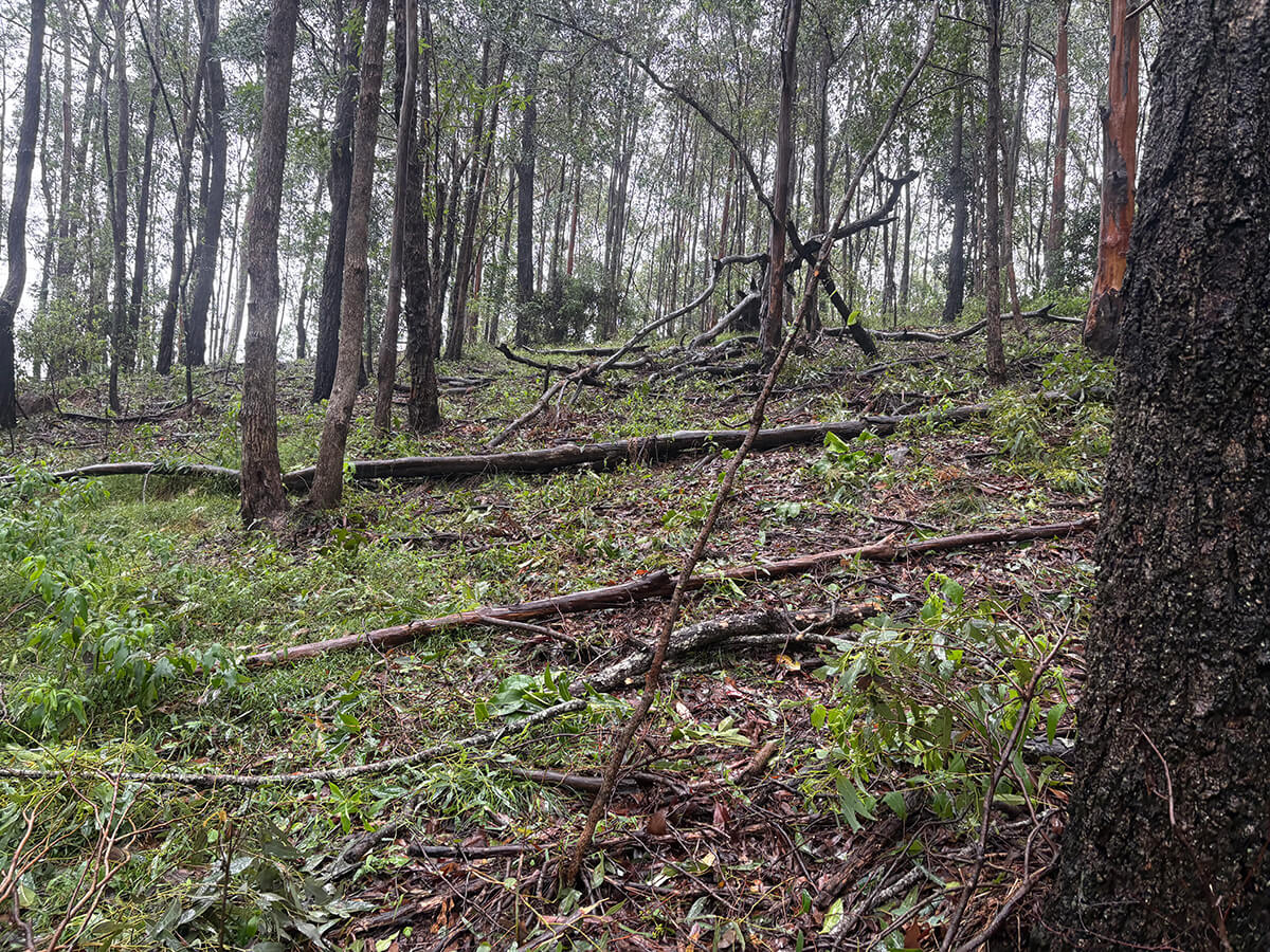 The northern drainage line is an established feral deer corridor between the cleared lowland to Mount Nathan Reserve. The eroding, bare deer tracks are treated by constructing low rock and log barriers, and by placing branches across the slope to trap sediment and reduce overland flow.