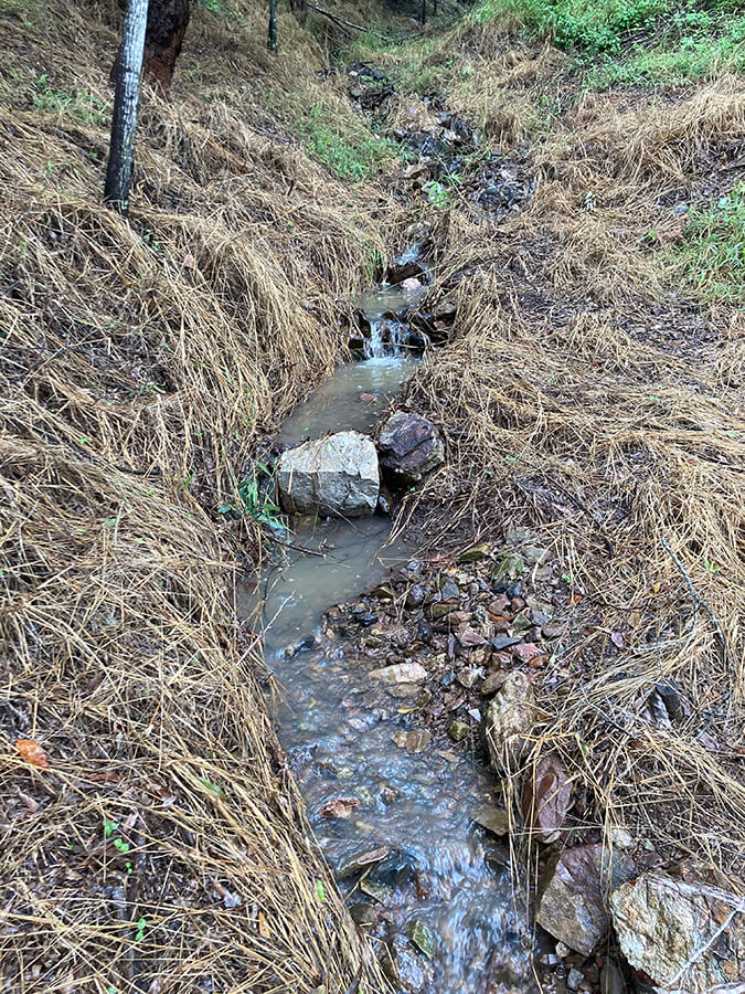 The two main structural forms implemented to control soil erosion of the land surface include rocks, branches and logs laid at right angles to the direction of the slope to reduce the speed of surface run-off and to trap sediment and debris. This is simple technology but is very effective when widely applied. These materials were used on the broad areas of hillslope and laid across small depressions where surface water concentrates. The basic principle is to slow the rate of runoff, trap and prevent sediment from reaching the drainage channel.