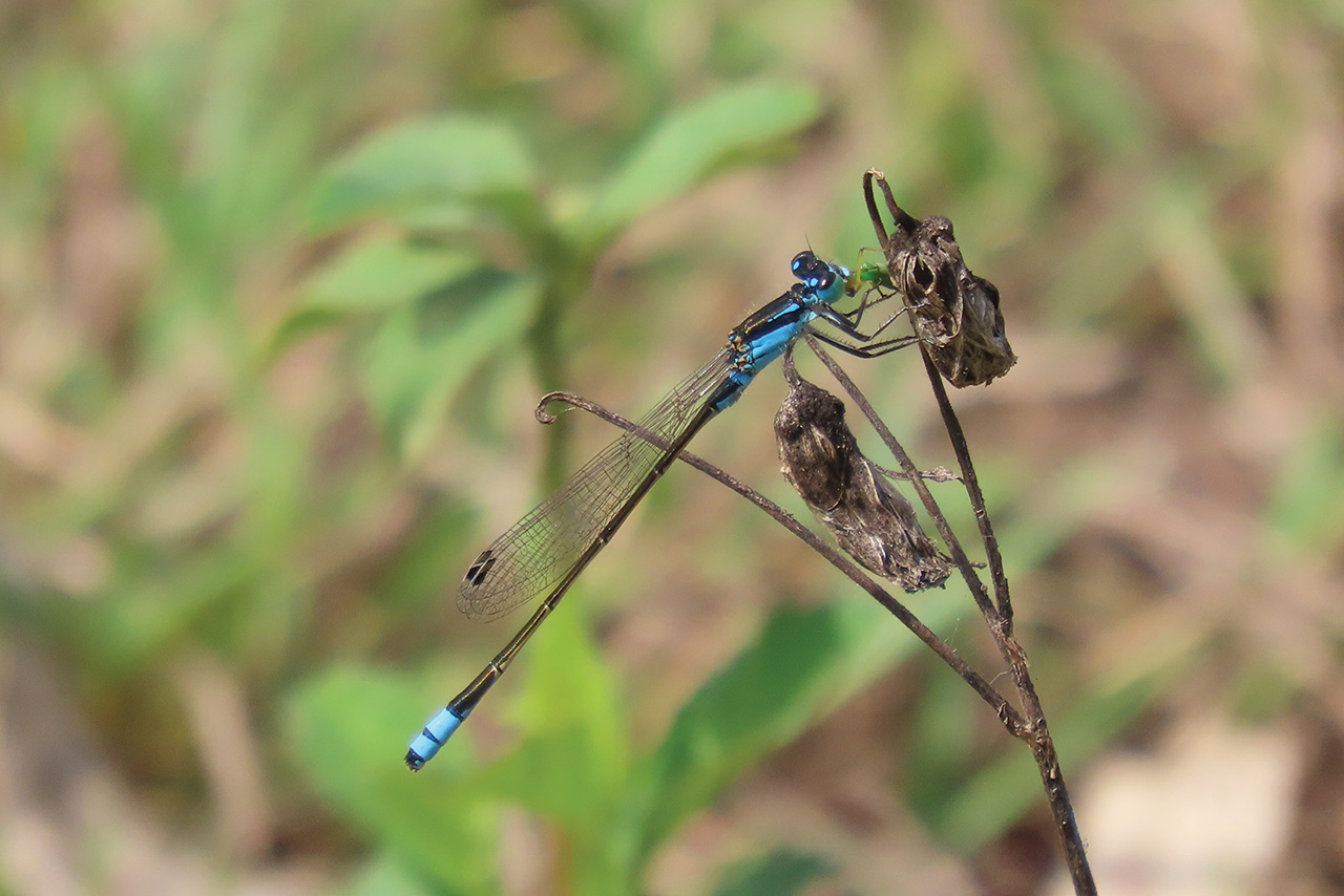 Like all insects, odonates have three body parts – head, thorax and abdomen. The head has a pair of large eyes and a pair of short antennae. The thorax has three segments, each with a set of legs. The last two segments of the thorax each have a pair of wings. Markings on the thorax can be helpful for identification. The abdomen is made up of many segments. The tip of the last segment can be helpful in distinguishing between the sexes.