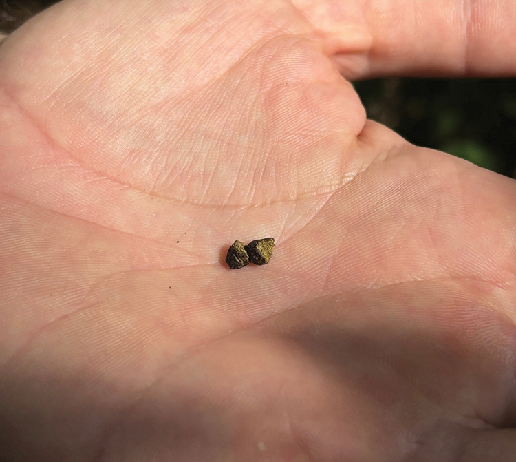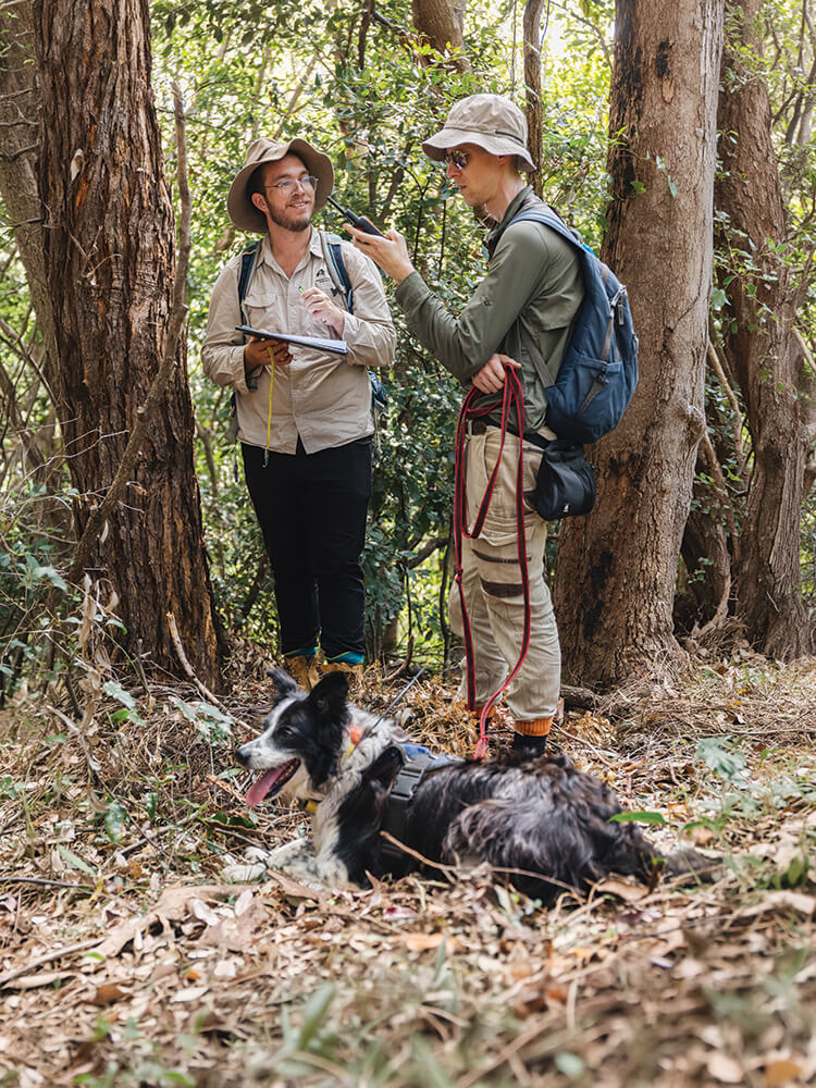 They then organised a visit from a Greater Glider detection dog, Austin, and his handler, Marcus, along with Michael Tervo and Greg Tasney from the Conservation Partnerships Team at Scenic Rim Regional Council. Austin sniffed around the base of the old dead standing tree, Nolan, and indicated that there was a Greater Glider scat present. It was tiny, and we would never have found it among the leaves without Austin and Marcus. The scat was only about 5mm in size. Koala scat was also found.